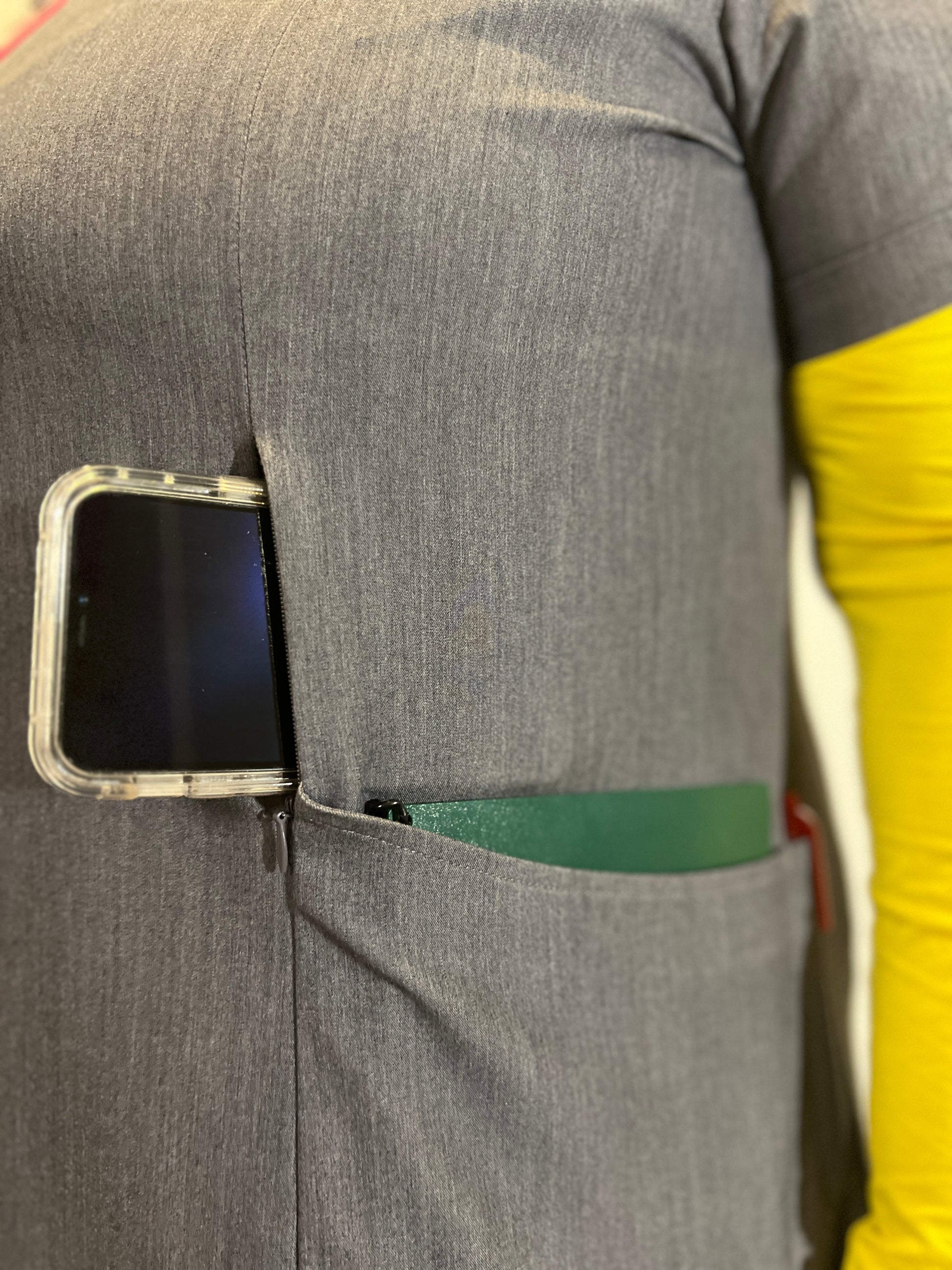 Sleek and versatile, the graphite gray modest scrub top blends professional polish with all the practical features you need. Tailored for Muslim women in medicine, this long scrub top keeps you covered while supporting every move you make.